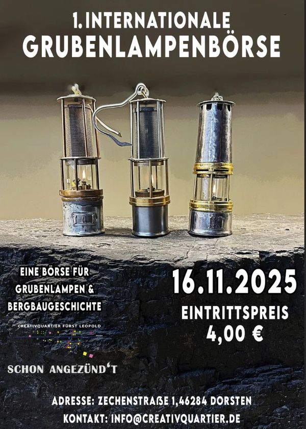 Am Himmelfahrtstag (29. Mai 2025) findet in der Zeit von 10 bis 17 Uhr zum vierten Mal die Grubenlampenbörse "Das Geleucht" am Trainingsbergwerk Recklinghausen statt. Die vergangenen Recklinghauser Börsen waren sehr gut besucht, das Angebot an historischen Lampen, anderen Bergbauantiquitäten und Literatur sehr umfassend.